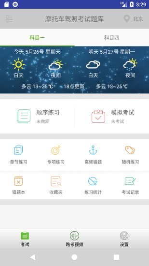 驾考摩托车试题软件中海量题库全面覆盖,最新交规政策及时推送,在线练习轻松快速提升,是一款很好用的驾考培训软件,新版摩托车驾照考试科目一驾考理论和科目四文明考试全新题库,以及科目二和科目三的路考视频,给你全面的指导。
