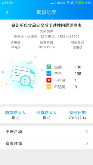 管理者:可以通过日常管理功能对辖内商户进行线上管理,随时随地查看商户信息,预防出现紧急问题。还可以通过自定义检查表进行现场检查 ,巡查记录全市动态更新。添加快速检测功能,检测报告一键生成并发送。