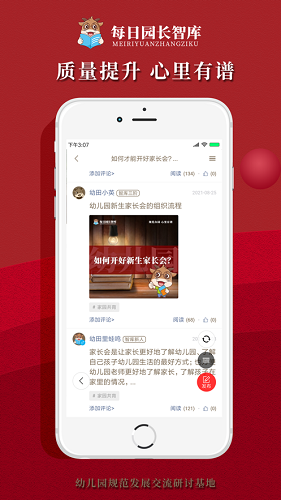 幼儿园规范发展中所需要的高含金量内容,在首页可查阅幼儿园园长、教师的优质观点与办园经验,并可与专家大咖近距离互动和碰撞;