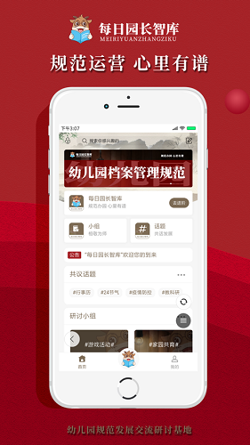 每日园长智库APP是一个幼儿园规范发展深度交流研讨社区,旨在让每一个幼儿园园长(经营者、创办者)在幼儿园的运营上都可以做到规范管理、规范运营、规范教学,从而让幼儿园规范发展,让办园质量层层递进、螺旋上升.每日园长智库,规范办园,心里有谱.