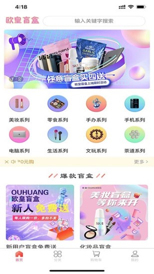 欧皇盲盒app涵盖了超多种类的盲盒来等你挑选,美妆、电脑、手机、零食、手办、文玩、生活、茶道等等等等非常的全面,让用户能够快速的在这里找打自己想要的哪一类商品进行盲盒的购买,超多的福利还能够让你买到最好的商品,每一次打开盲盒都是一种惊喜,超级好用。