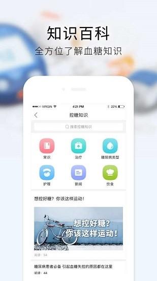 内容涵盖饮食、食物库、运动、治疗、常识等相关糖尿病知识,让您全方位地了解关于糖尿病的健康知识。