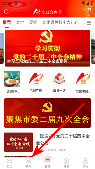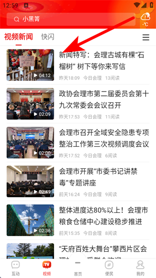 1、打开今日会理APP首页,点击底部视频,进入视频新闻页面。