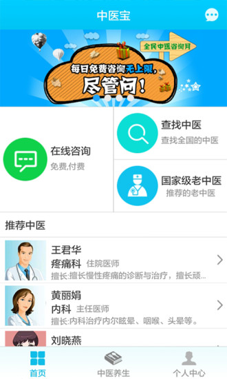 中医宝app是一款专业的医疗咨询软件。主要包括免费咨询和付费资讯咨询两大服务板块。为用户提供了针灸推拿、食疗 、药膳等医疗健康知识。患者用户可以在线向医生咨询身体疾病方面的各种问题,快速为您解难答疑。是您身边贴心的健康管家,欢迎用户下载使用。