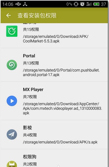 2.权限狗,将应用分为已安装应用及SD未安装应用,嗅探APK权限从此易如反掌,敏感权限红色标出,是否越权一目了然.