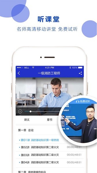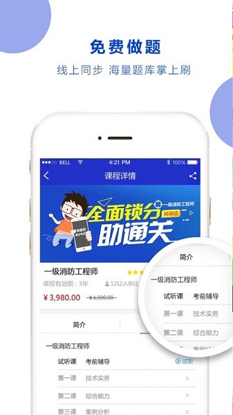 一款专业培训应用,主要针对“一级消防工程师”、“建造师”、“”造价工程师“、”消防操作员“等专业知识提供了课程讲解,在线练题。是您学习的好帮手!