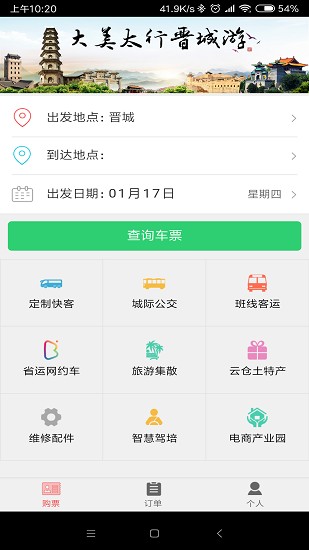 大美太行晋城游在这里你可以自由进行订票,输入起始地以及目的地就可以为你显示多种出行方式,让你可以自行选择对应的交通工具进行购票。平台上还可以同时购买多张票,也可以一次为自己预订来回往返的票。平台上也支持同城打车服务哦,欢迎有需要的朋友下载使用!