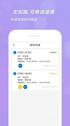 2、通过智能钥匙柜app可申请预约密钥使用,管理员审核通过后方可获取使用权限;