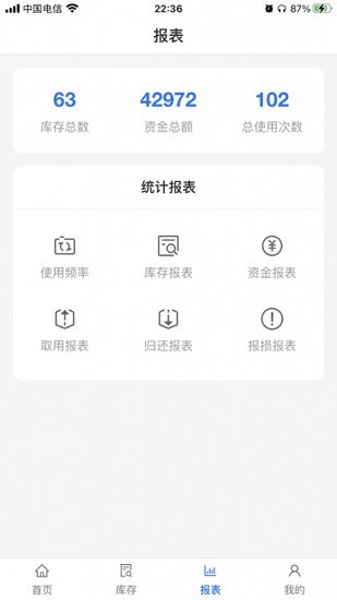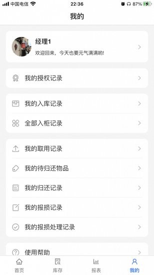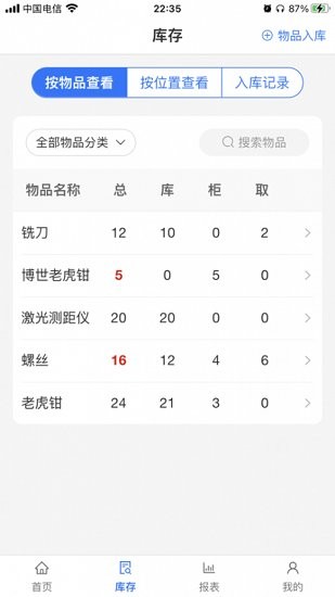 3、为用户提供了智能库存柜的管理功能,用户可以在这里对于物品、库存、人员、取用、归还、以及报损报表等等的功能信息进行查询使用。