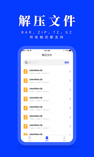 支持ZIP,7z,RAR,GZIP, ISO等格式解压缩,并支持加密压缩包解压;解压速度极快,压缩文件支持多种格式多种压缩模式,并且还支持分卷压缩,加密压缩等等;解压缩全能王界面清新操作简单方便,化繁为简。