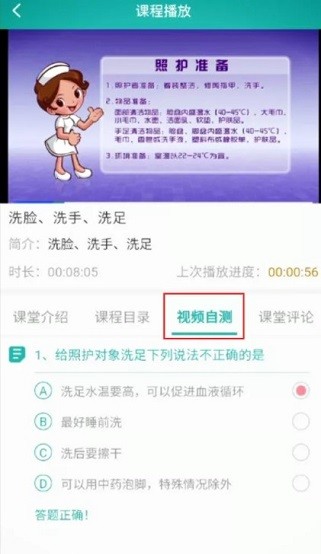 注意:照护人一定要认真观看视频,在观看完视频后会有一个【视频自测】,需完成里面的题目,方可进行下一个视频的观看。