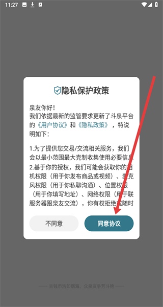 1、点击“隐私保护政策”弹窗的“同意协议”,进入斗泉APP主界面。