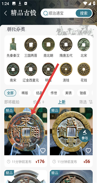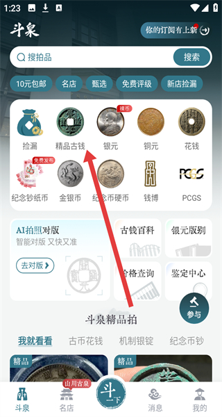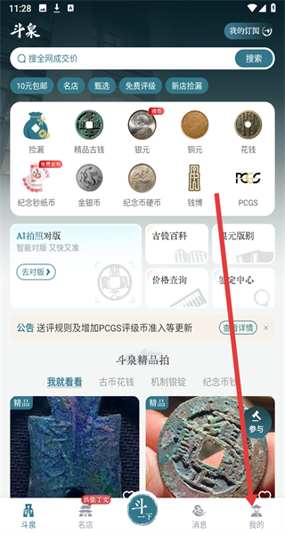1、在斗泉APP首页点击“精品古钱”,进入精品古钱分类页面。