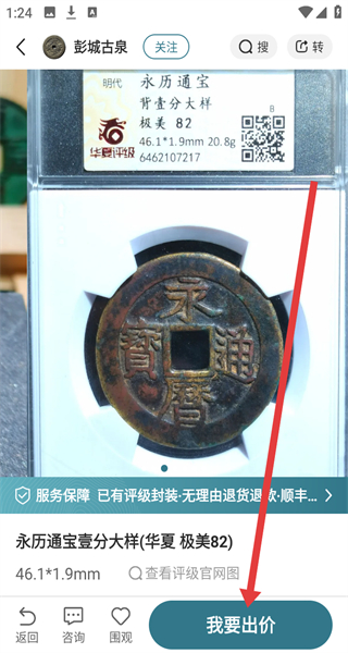 2、精品古钱分类页面选择“永历通宝”拍品,进入拍品详情页面。
