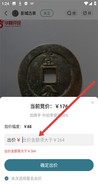 4、出价界面输入大于264元的出价金额,点击“确定出价”,完成出价操作。