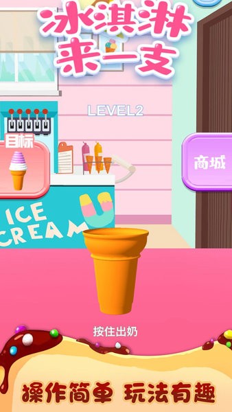 冰淇淋来一支玩法很有创意,玩家将在游戏中尝试自己动手制作冰淇淋,操作简单易于上手,卡通绚丽的画面更是养眼,超多制作工具都可以免费使用,让你轻松就能做出美味的冰淇淋,除此之外还有各种各样的水果食材,可以自由搭配添加,完成关卡要求的任务。