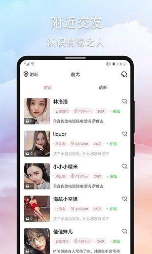在这里你可以寻找你的TA哦!我们有超过10万的真人用户,每个用户都是通过视频真人认证后才能使用的!覆盖面积广,资源丰富,很快的找到你附近的Ta哦.
