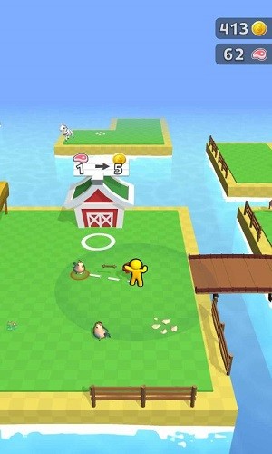休闲娱乐类游戏.玩家操控人偶在农场内利用弓弩对动物进行射击,并拾取它们掉落的肉类,利用肉类去商场兑换金币;金币可用于拓宽狩猎领地,升级弓弩,增强攻击力,还可以招募帮手,帮你一起狩猎动物.