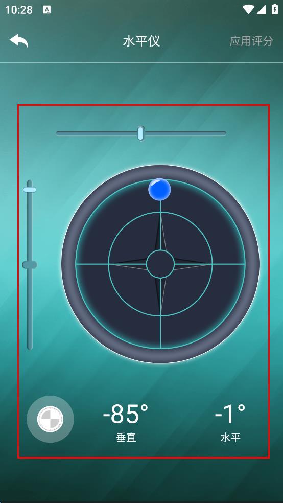 2、将设备放置在需要测量的物体上,观察水平仪界面的蓝色球体和角度数值。
