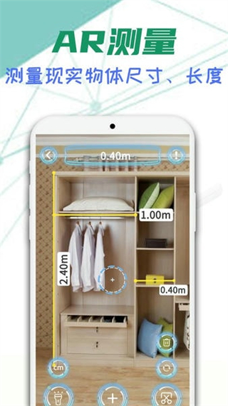 1、创新采用AR技术为用户快速测量,可以测量真实世界的一切物体;