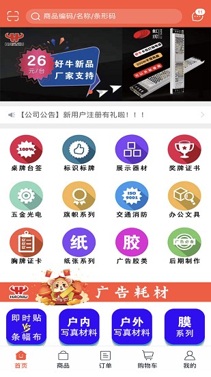 好牛商城app是一款广告材料购买的平台,平台让采购变的更加简单,里面有非常多的种类能够给您挑选,您也可以根据自己的需求去平台上面搜索,首页有非常多的广告种类,各式各样,您都可以点击查看。