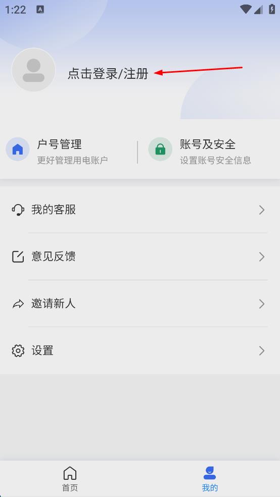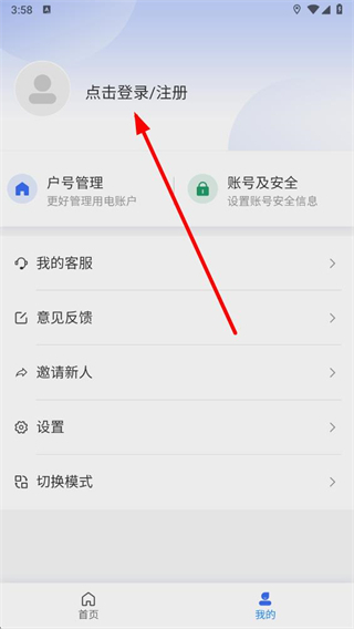 2、在“我的”页面,点击“点击登录/注册”按钮,进入登录注册页面。