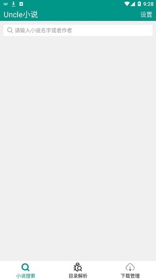1、下载安装好app后即可运行软件,首先主界面直接是“小说搜索”版块,可直接在输入框输入小说名字或者作者来进行资源搜索;