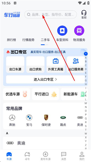 1、打开车行168,找到并点击顶部的搜索框。