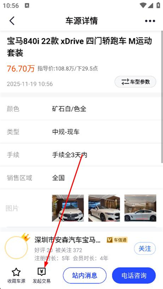 4、进入详情页面,点击下方发起交易即可买车。