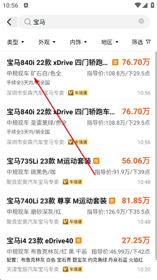 4.找车源:根据品牌、车型、地区、颜色、配置...筛选感兴趣的车源