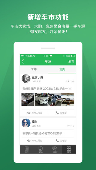 提供售卖、求购二手车服务,相当于二手车跳蚤市场,您可以将买车、买车的信息在车市上发布,方便任何用户随时查看和联系