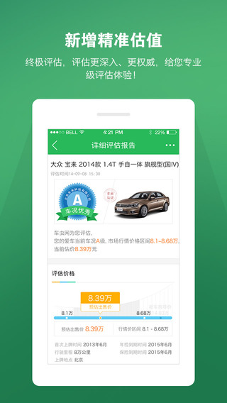通过选择二手车车型、上牌时间、所在地及形式里程,快速帮您评估出合理的出售价格、市场价格区间,并提供新车指导价格以供参考,选择详细车况信息后,可以帮您进一步评估车辆价值,形成完善的二手车评估报告