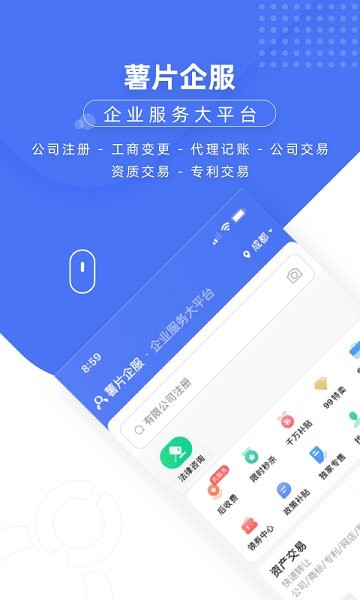 薯片企服app是成都薯片科技有限公司旗下自研可信企业服务平台,薯片企服app依托智能科技,传递价值生意,致力于为全类型,各阶段的企业及个人提供:工商服务、会计代理、财税咨询、知识产权代理、资质许可证办理咨询、品牌设计、IT/软件、营销推广、人事社保代理等多品类的线上服务。