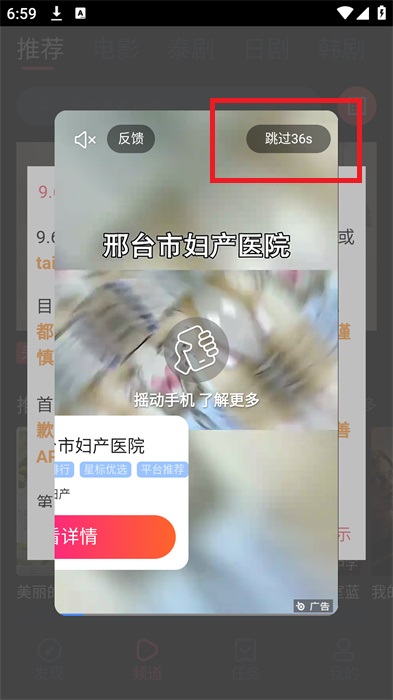 1、确保我们手机上的泰剧兔是正版的软件,然后打开软件进入到首页之中,会看到有一个广告弹窗,不需要等待数秒结束,就可以直接【点击跳过】跳过广告;