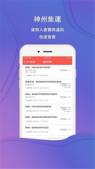 神州集运app能够帮助广大的用户们在这里快速查看各种物流的状态还能够支持一键寻找订单,查看每一笔订单的物流状态和相关的运费等等,让用户们能够更好的对订单以及货物进行处理和提前操作。软件还提供集运、地区派送、自取点取货、国际转运等等功能,非常的方便。