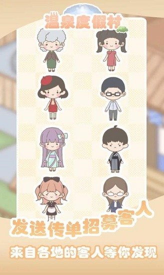 玩家需要去招募其他的员工,帮助自己来经营温泉度假村,使其变得更加美好,吸引更多顾客。在游戏中,你可以准备可口夜宵,想要所有来放松的客人们都能够有一次满意的度假之旅。在游戏过程中还会触发一些特殊的事件,碎片化的剧情为玩家带来乐趣。
