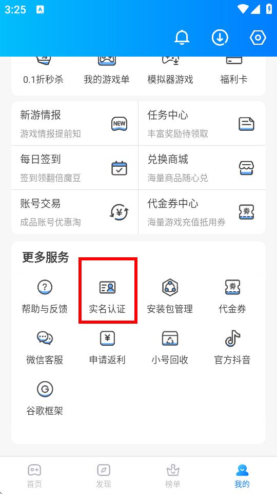 2、在个人页面的更多服务板块中,点击实名认证选项。