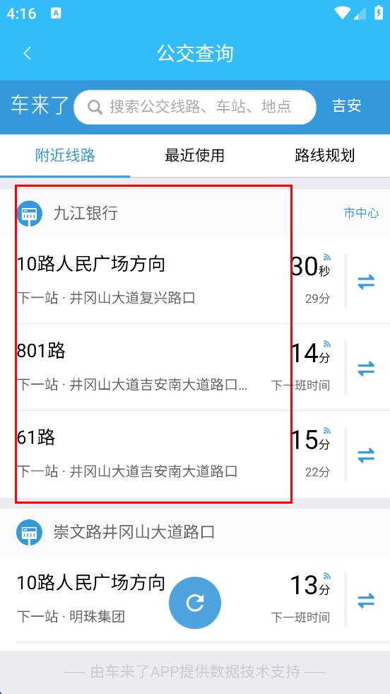 1、打开吉安公交服务软件,在首页功能选项中找到“公交查询”选项并点击,进入公交查询页面,可看到附近线路、最近使用等标签。