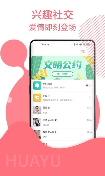 花遇交友app非常实用的语音聊天软件,丰富的超多的用户在线交友护体丰富等你的参与,视频聊天,语音聊天超多话题让你不尬聊自由的社交,同城附近交友让你更好的线下约会,快来下载试试吧!