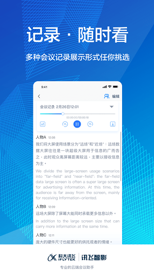 讯飞智影app是配讯飞推出的配合其智能办公硬件设备打造的手机客户端,主要是用于平常的云端会议,在讯飞智影app上可以查看会议记录,查看文件信息,还有手机电脑连接投屏,也能随时提取会议记录等等!