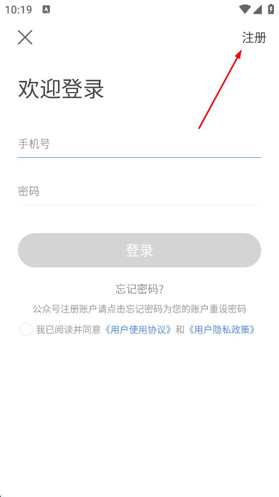 3、在登录界面,点击右上角的“注册”选项,进入手机号注册页面。