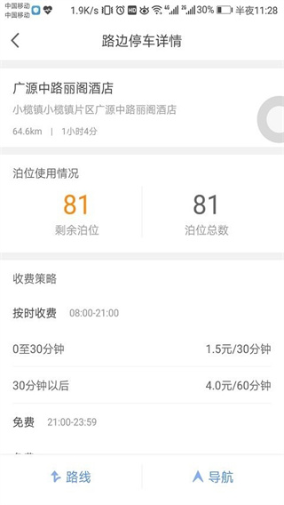 3、路边车位搜索,在地图上选择你的路线即可发现沿途可用车位。