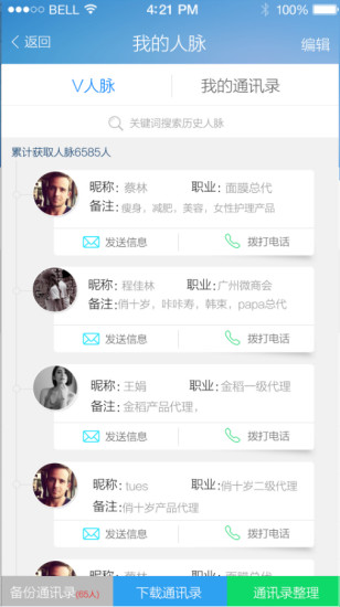 让天下人的生意更好做,现在做生意,难吗?难!竞争压力大,稍微把握不到位,就会被对手抢去先机。黄页都翻烂了,你的生意人脉找到了吗?电话都打爆了,你的生意人脉找对人了吗?你想要的人才、客户、资源、供应商、合作方、专家等,哪可以给到你?!上V脉你就能找到。有V脉,让天下人的生意更好做。在V脉有亿万的活跃用户,50万的精英群体,过百万的达人用户,为你的生意圈解决人脉问题。无论是商务精英、大企业主还是各领域达人,关键词一键锁定,你的生意之路畅通无阻!