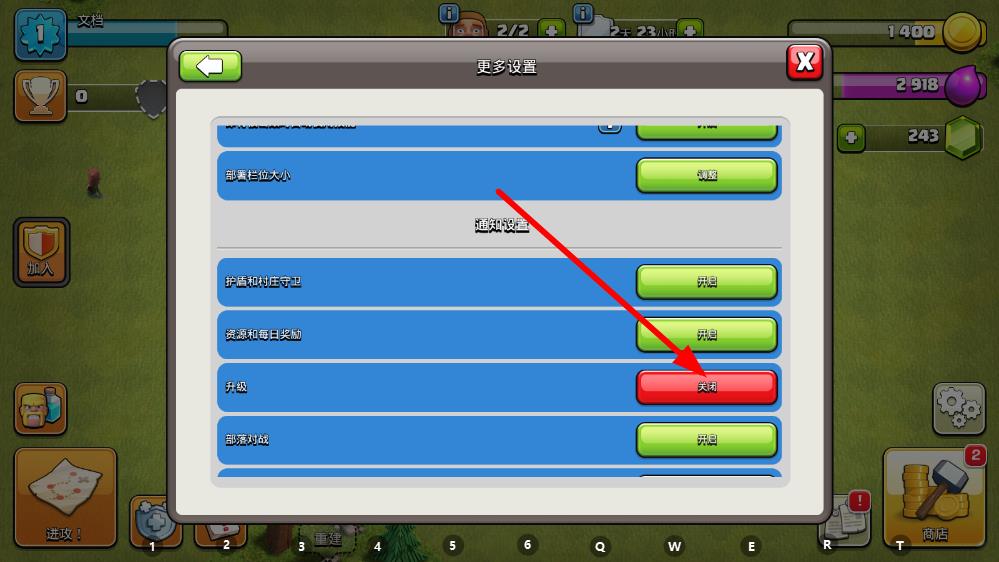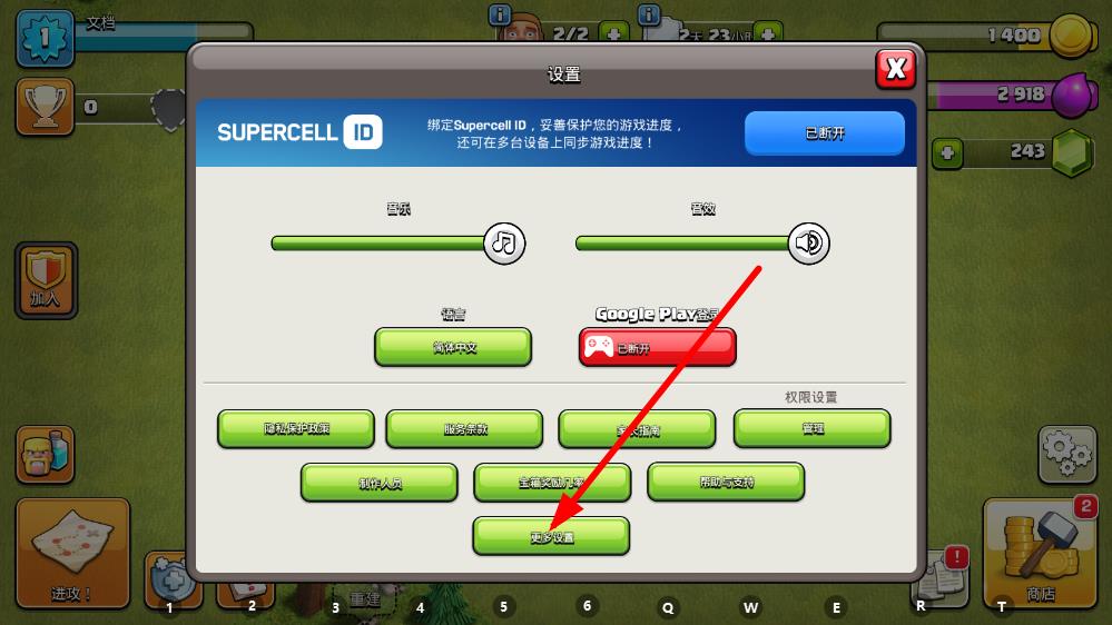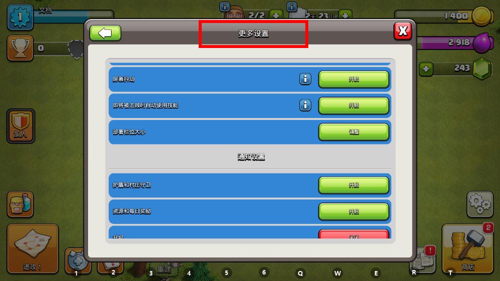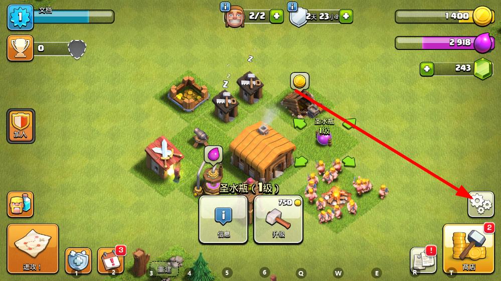1、进入部落冲突游戏主界面,点击右下角齿轮状的设置按钮。