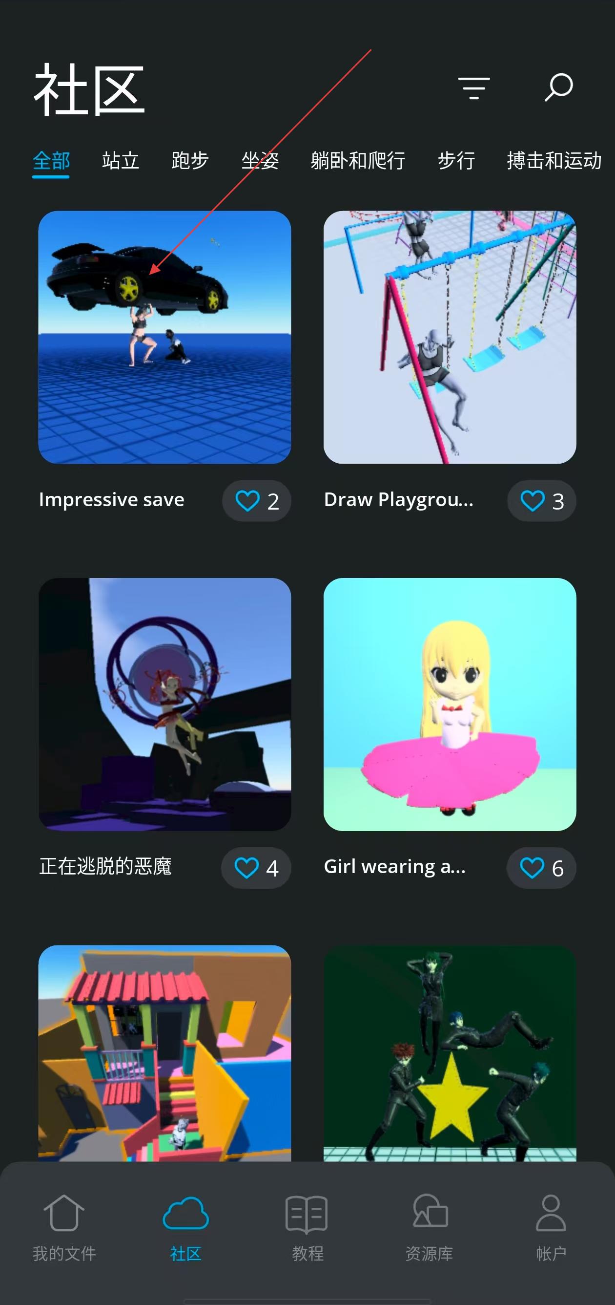 1、打开魔法人形师应用并点击底部导航栏中的社区选项,进入社区页面浏览各类作品,找到想要保存的文件。
