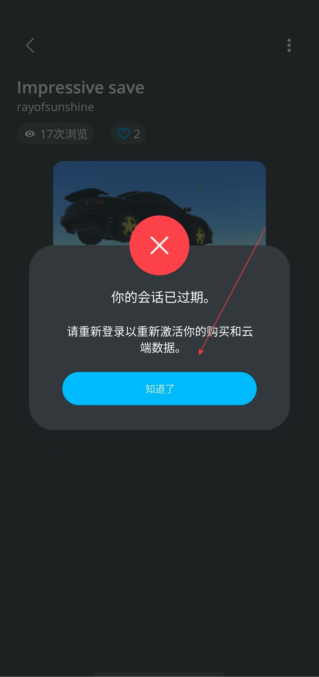3、若出现你的会话已过期,请重新登录以重新激活你的购买和云端数据提示弹窗,点击知道了,随后重新登录账户,再重复步骤2即可完成保存。