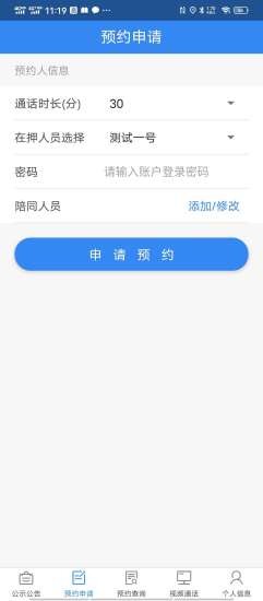 3、家属上传的绑定在押人员资料审核通过后,登陆账号进入系统预约申请界面,选择相应的罪犯与会见时长,输入账号登陆密码后点击申请预约按钮,如需添加陪同人员请点击添加按钮,跳转到陪同人员添加界面。