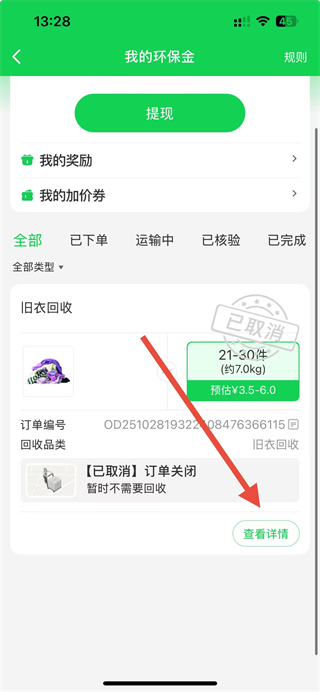 3、在回收订单列表里,找到目标订单后,点击其下方的查看详情按钮,进入该订单的详情页面。