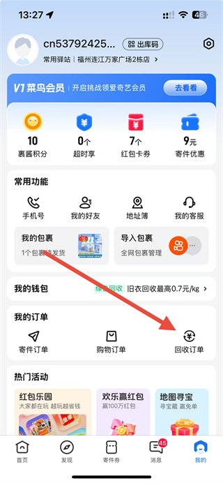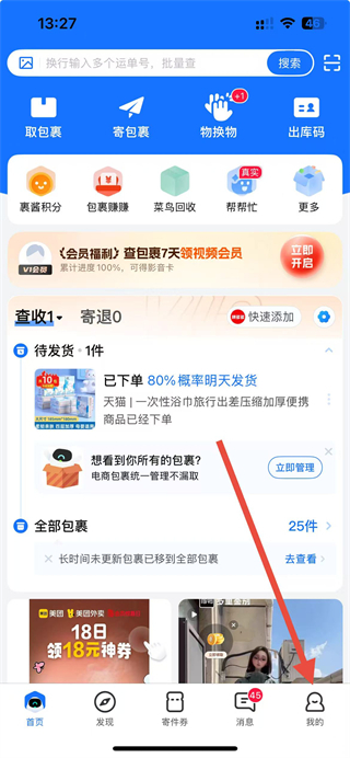 1、在菜鸟裹裹app首页点击我的选项,进入个人页面。