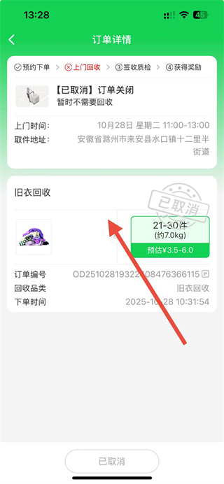 4、在订单详情页面,即可查看回收订单的上门时间、取件地址、订单编号等完整信息。